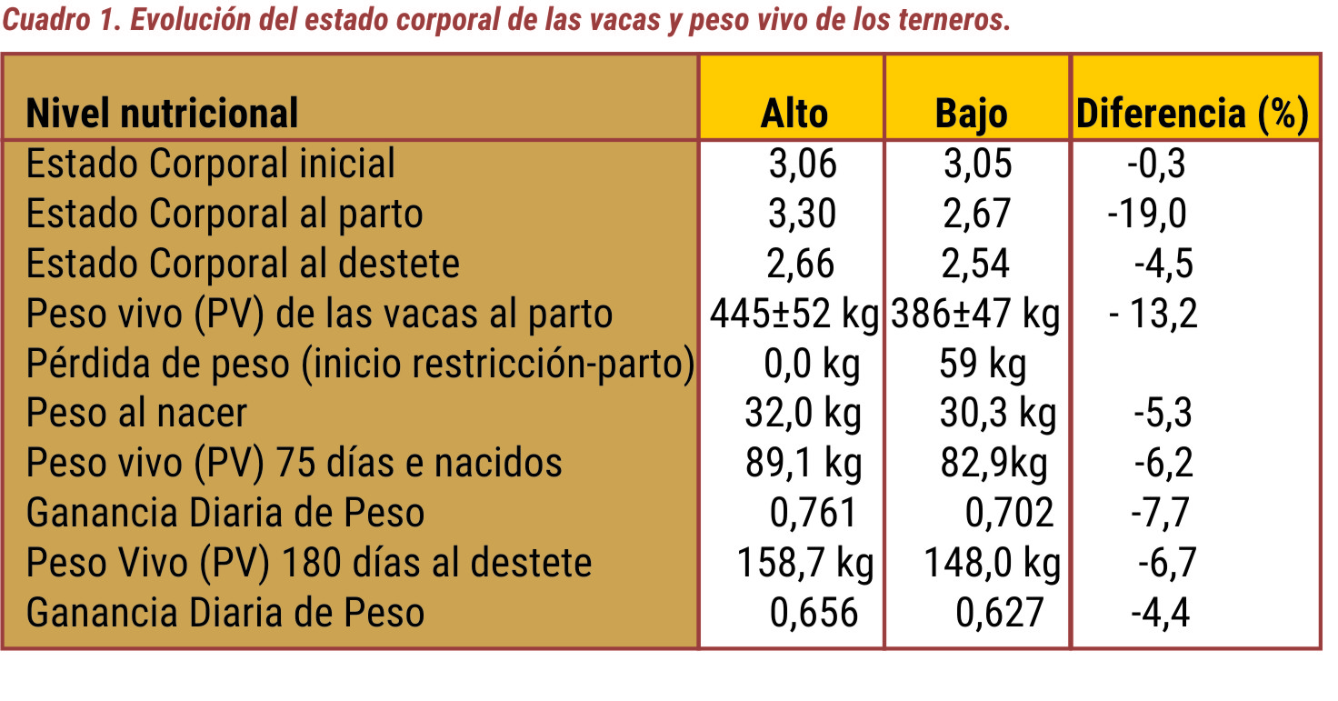 En este ensayo se observó que la restricción alimentaria en las vacas al 50% de los requerimientos generó terneros que pesaron casi 2 kg menos al nacimiento, menores ganancias de peso durante la lactancia y casi 11 kg menos de peso al destete comparado con las vacas que fueron alimentadas al 100% de sus requerimientos.