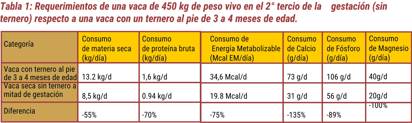 Es sabido que cuando a una vaca se le saca el ternero (destete) sus requerimientos se reducen significativamente. En la tabla 1 se presentan los requerimientos de una vaca seca en la mitad de la gestación (sin ternero) respecto a una vaca con un ternero al pie de 3 a 4 meses de edad.