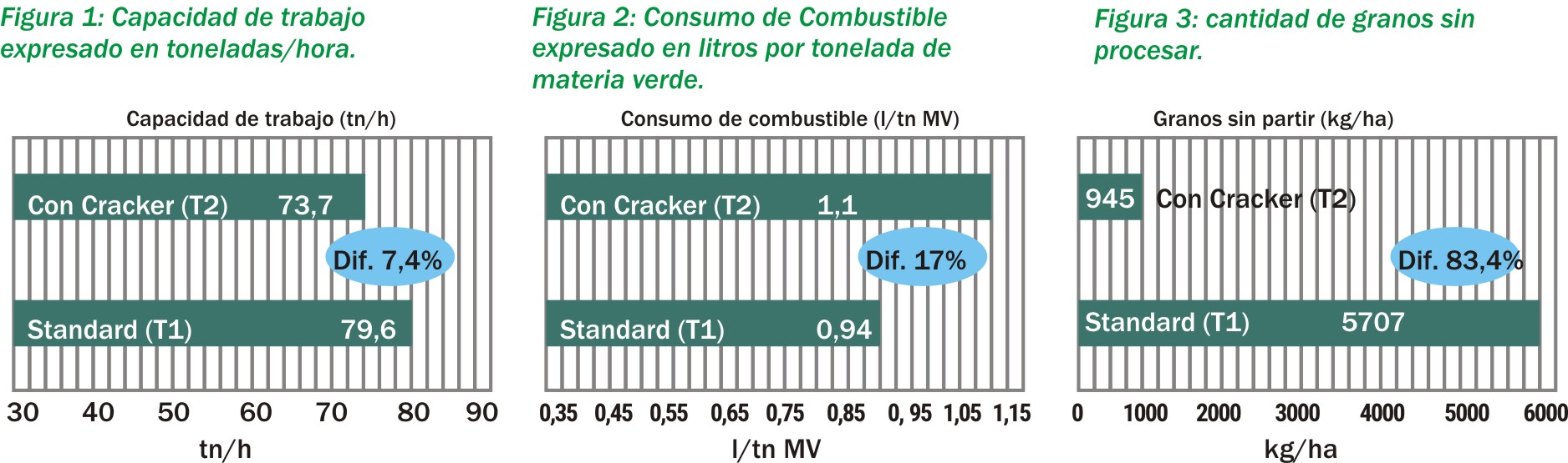La capacidad de trabajo de la picadora, también se vio afectada por la acción del procesador de granos. Mientras que en la versión standard (T1) la máquina procesó 79,6 tn Mv/h, al actuar con el procesador de granos activado logró procesar 73,7 tn MV/h. La mayor demanda de potencia que implicó la utilización del procesador de granos produjo una caída en la capacidad de trabajo igual a 5,9 tnMV/h que representa una reducción del 7,4%.