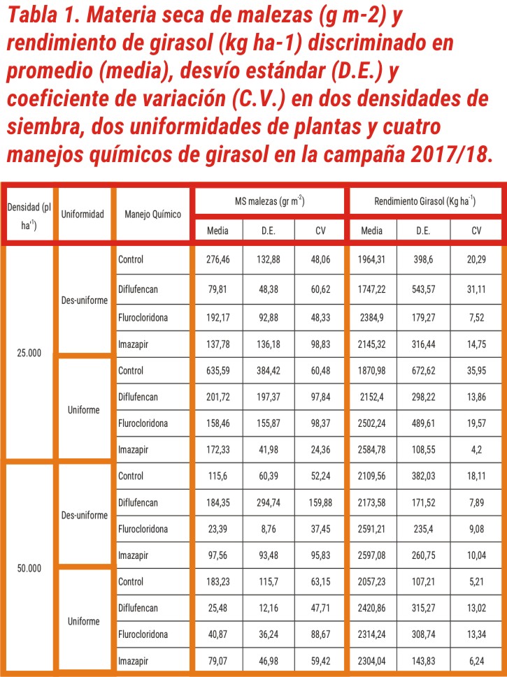 Los resultados en arreglos desuniforme dieron que en la densidad 50.000 pl ha-1 el rendimiento del girasol fue 15% mayor a 25.000 pl ha1 y que los herbicidas de T1 (Flurocloridona + Acetoclor) y T2 (imazapir) fueron mayores al control en 22 y 16%, respectivamente. En cambio, cuando el cultivo estaba uniforme, el rendimiento no presentó diferencias estadísticas cuando se variaban las densidades y manejos químicos.