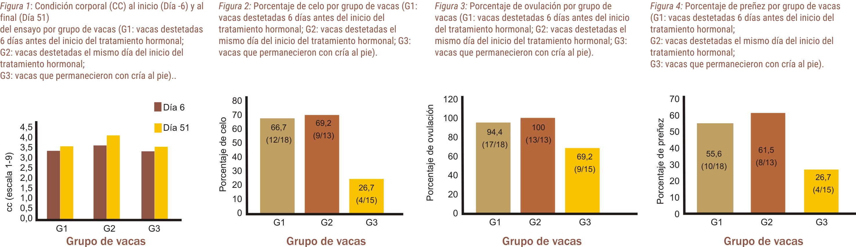 Se llevó cabo en la localidad de Las Garzas, Santa Fe. Se utilizaron 46 vacas cruzas Cebú multíparas con cría al pie. Al inicio de la experiencia (Día 17/10/2017) las vacas tenían entre 60 y 90 días posparto aproximadamente; se evaluó la y fueron asignadas al azar a 3 grupos. Dieciocho vacas fueron asignadas al grupo (G) 1 y destetadas 6 días antes del inicio del tratamiento hormonal, trece vacas fueron asignadas al G2 y destetadas el mismo día del inicio del tratamiento hormonal y quince vacas asignadas al G3 (testigo) que permanecieron con cría al pie. El Día 23/10/2017, se destetaron las vacas del G2 y todas las vacas fueron tratadas con un dispositivo intravaginal con progesterona y una inyección intramuscular de benzoato de estradiol. El día 30/10/2017, se retiró el dispositivo intravaginal y se aplicó una dosis de prostaglandina, una de cipionato de estradiol y otra de gonadotrofina coriónica equina. A las 53-56 hs (Día 01/11/2017) de retirado el dispositivo se realizó la IATF con el mismo operador y semen de un toro. Todas las vacas fueron pintadas en la base de la cola al retiro del dispositivo como indicador del celo. Al momento de la IATF, las vacas despintadas en más de un 30% fueron consideradas en celo.