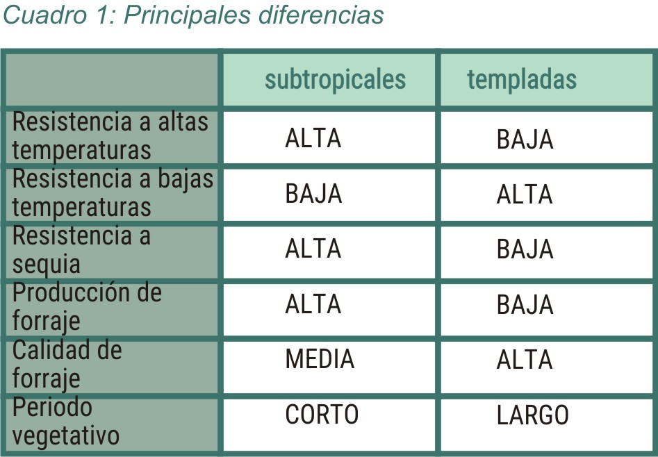 Las características generales de la adaptación, producción y calidad de las pasturas subtropicales en comparación con las templadas (que se presentan en el Cuadro 1), nos determinan las principales limitantes a resolver: un período de producción de pasto restringido básicamente al verano con una calidad mediana durante su ciclo de producción y baja en el invierno.