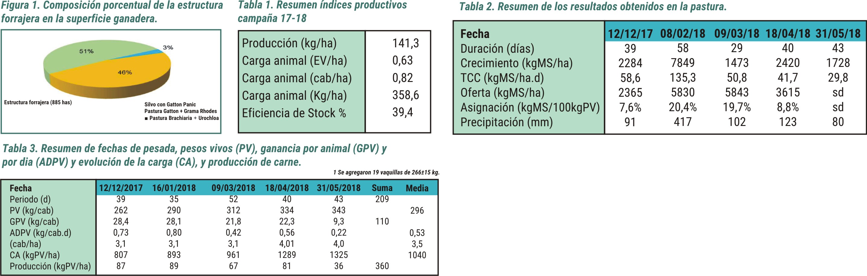 En cuanto a infraestructura el campo posee buen nivel de apotreramiento (26 potreros en total) con sus respectivas aguadas. Sin embargo, ya que Gatton Panic y las demás megatérmicas acompañantes, presentan un gran crecimiento estival, en el pastoreo principalmente de la recría, los potreros son grandes (promedio aprox. 50 hs) resultando en un pastoreo casi continuo o de muy larga duración, con marcada variaciones en forraje disponible y calidad del mismo, lo que se refleja tanto en una baja eficiencia de uso del forraje y como en una decreciente ganancia individual de los animales a lo largo del ciclo. Esta es una situación que frecuentemente se observa en los sistemas productivos de la zona basados en estas pasturas. Para mejorar estos aspectos es recomendable la implementación de pastoreo rotativo con una carga adecuada y una suplementación estratégica. Sin embargo la correcta implementación implica una adaptación de la técnica al sistema y el aprendizaje por parte del personal que lo maneja.