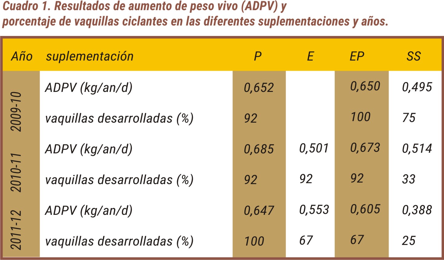 Los resultados que se muestran en el cuadro 1 representan el promedio de las ganancias diarias obtenidas para las diferentes dietas en los tres años de evaluación y el porcentaje de las vaquillas desarrolladas ciclantes. Se puede ver que la suplementación estival mejoró la ganancia diaria de peso y el desarrollo genital de las vaquillas, comparando con las que no fueron suplementadas . Y, que el impacto de la suplementación estival tiene mejores resultados en veranos secos donde las ganancias de los animales sin suplementar no superan los 400 g diarios (período 2011_12).