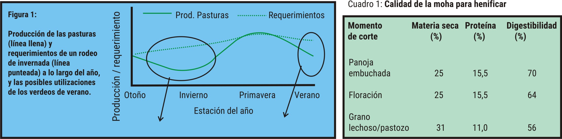 Como lo indica la Figura 1, los verdeos de verano presentan la ventaja de poder ser utilizados estratégicamente en distintos momentos del año: en verano en pastoreo directo o transfiriendo el forraje generado hacia el invierno, mediante la utilización de diferentes tecnologías como el diferimiento en pie, la henificación o el ensilado. Ya sea que su uso se haga bajo pastoreo o como reserva, los verdeos de verano permiten estabilizar la oferta forrajera en los sistemas de producción de base pastoril, puesto que pueden atenuar tanto el déficit estival como el bache de producción de forraje otoño-invernal que presentan las pasturas perennes o el pastizal natural.