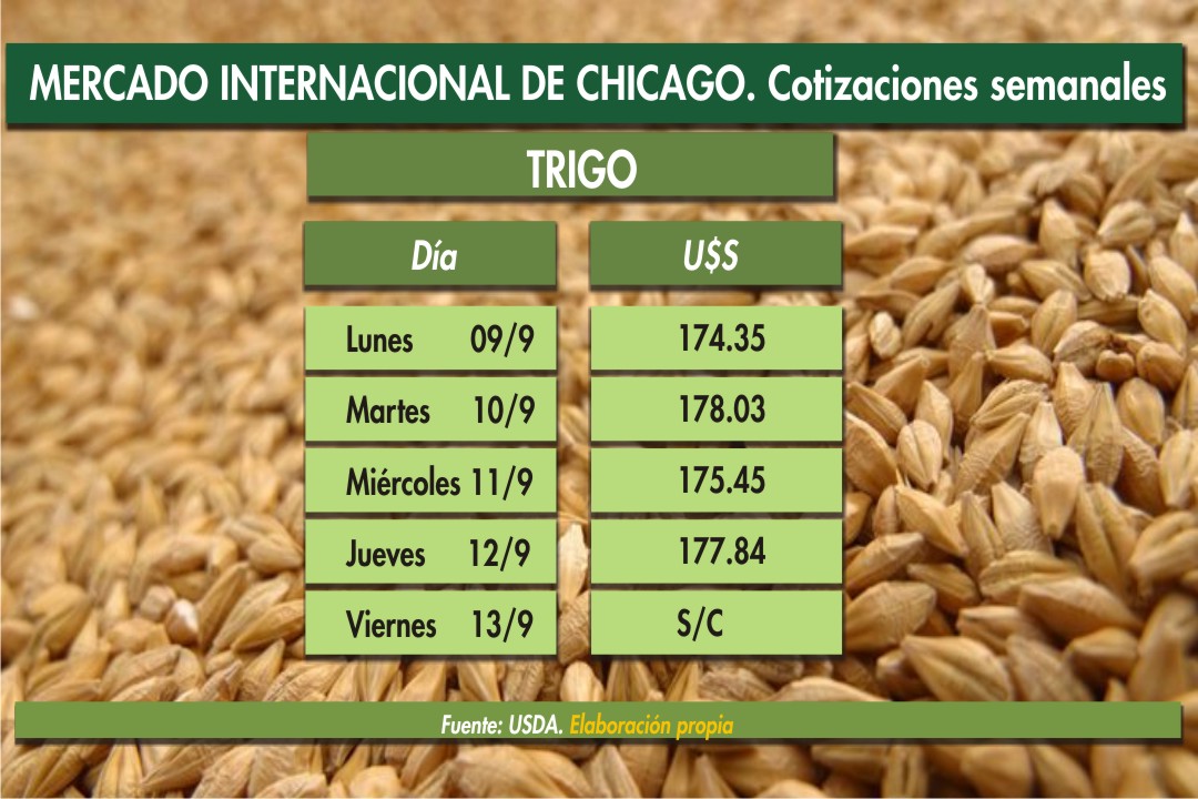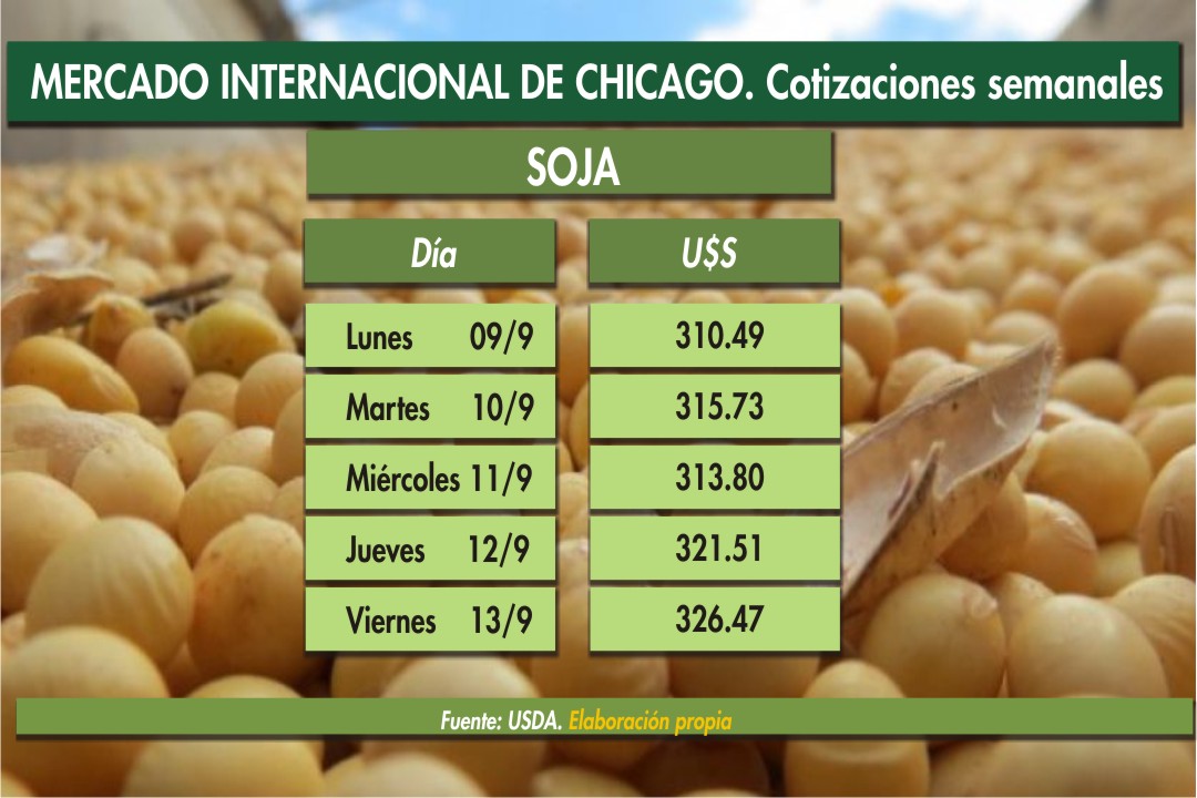 Precios semanales comparativos de las comodities agrícolas en la Bolsa de Chicago.